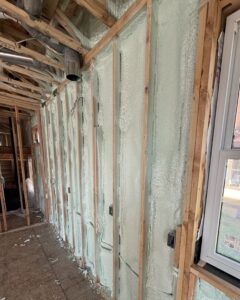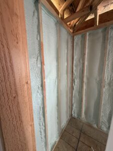 Notice in the picture that there are no vapor boxes in the outer wall. The 2″ of 2 lb closed cell spray foam is not only a seal against air infiltration into the insulation. It is also the vapor seal for the home. The bonus here is that the wall can breathe into the inside of the house. Water vapor can move into the interior side of the wall. It is stopped by the 2 lb closed-cell spray foam and released back into the home—eliminating the risk of getting trapped in the wall by a plastic vapor barrier. The outside of the wall, with the building paper and rain screen installed, can shed moisture to the outside, eliminating the risk of getting trapped between the sheathing and rigid foam insulation boards used for exterior continuous insulation.