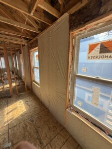 Insulation is being installed in the Minneapolis build by Icon Homes. The 2 lb closed-cell spray foam is installed, and the netting for the blown insulation is being fitted. The fiberglass batts visible on the floor are for the header areas where the 2 lb closed-cell spray foam did not fill the space. The header area is too small volume-wise for the blown-in insulation, so fiberglass batting is used.