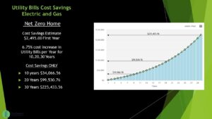 The upgrade costs cover several different styles of construction for this home. If we are looking for the shortest ROI (return on investment) the lowest figure of the cost upgrade range (using EcoSmart™ Studs) makes the most sense. It would take about 7 years of saving to equal your Net Zero home upgrade cost investment. Even at the higher cost upgrade range the ROI is under 10 years and that is at only with utility bill costs going up 6.75% per year, the historical average. Any higher increase per year shortens the ROI figure considerably in the first 10 years.