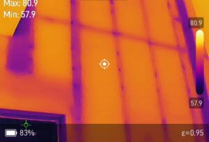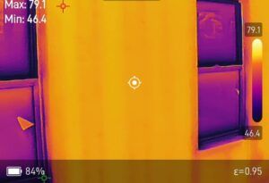 Notice in the solid stud area we see gold studs showing in more of a purple wall area. That is thermal bridging. The studs are considerably warmer than the chamber insulation. Lets take a look at wall area from the inside.