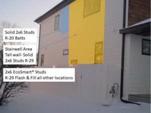Another benefit of this Minneapolis build is the tall wall in the stairwell, which uses 2×6 solid studs. Now we have the perfect comparison: 2×6 EcoSmart® Studs and solid 2×6 studs in the same house, under the same harsh weather conditions. Let’s take a look!