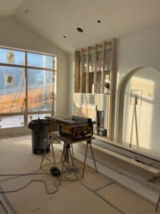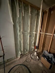This home is insulated slightly differently from the Minneapolis build. They are using more 2lb closed-cell spray foam in the chamber than in the Minneapolis build to exceed the current Minnesota Energy Code requirements. This build also includes some double-stud walls throughout the home to allow room for the automatic shades. These double-stud exterior walls, along with EcoSmart® Studs, will minimize thermal bridging and raise the effective R-value of the exterior the at a very low cost compared to exterior continuous insulation (ECI).