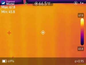 From the inside it’s hard to detect wall studs. With the complete thermal break between the outer and inner walls, there is little temperature difference between the interior wall materials. Studs show up as even more ghostly images than in the Minneapolis build.